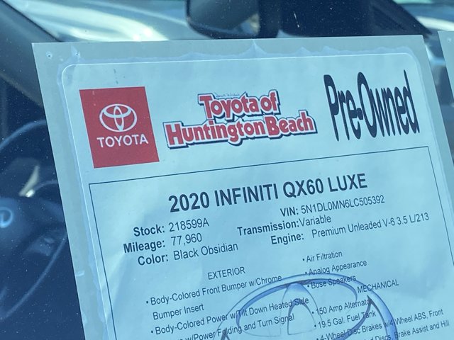 AS IS! Looks and runs great. Good tires and brakes. FREE CARFAX! Black Obsidian 2020 INFINITI QX60 LUXE FWD CVT 3.5L V6Recent Arrival! 20/27 City/Highway MPGWHY BUY at the BEACH? Our customers are our most valuable asset. If you are already a customer, welcome back. If you are new to Toyota of Huntington Beach, we would like to convince you to join the ranks of satisfied Toyota of Huntington Beach customers.
