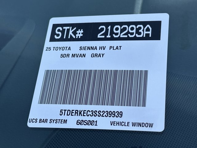 Looks and runs great. Good tires and brakes. Engine and transmission run smooth. Damage free. Immaculate inside and out. FREE CARFAX! We have great interest rate and financing for ALL credit situations.. Magnetic Gray Metallic 2025 Toyota Sienna Platinum 7 Passenger FWD CVT 2.5L I4 Hybrid w/VVT-iE DOHC 16V 2.5L I4 Hybrid w/VVT-iE DOHC 16V.36/36 City/Highway MPGWHY BUY at the BEACH? Our customers are our most valuable asset. If you are already a customer, welcome back. If you are new to Toyota of Huntington Beach, we would like to convince you to join the ranks of satisfied Toyota of Huntington Beach customers. Financing for all situations. Great rates available. GREAT rates for good credit. Financing for ALL credit situations. BK ok. Low score OK. (See dealer for details.) Se Hablamos Espanol. Marticular OK.